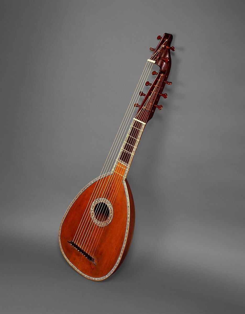 Angel lute or angelique with 7 treble strings and 4 bass strings, the unfretted basses having a separate pegbox. Jean Francois Tiphanon, Paris, 1782.