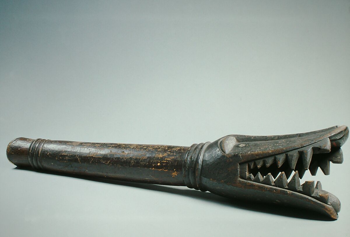 Wood megaphone with transforming mask motif. In profile, the voice disguiser is a ferocious crocodile but from the front it is an ancestor spirit.