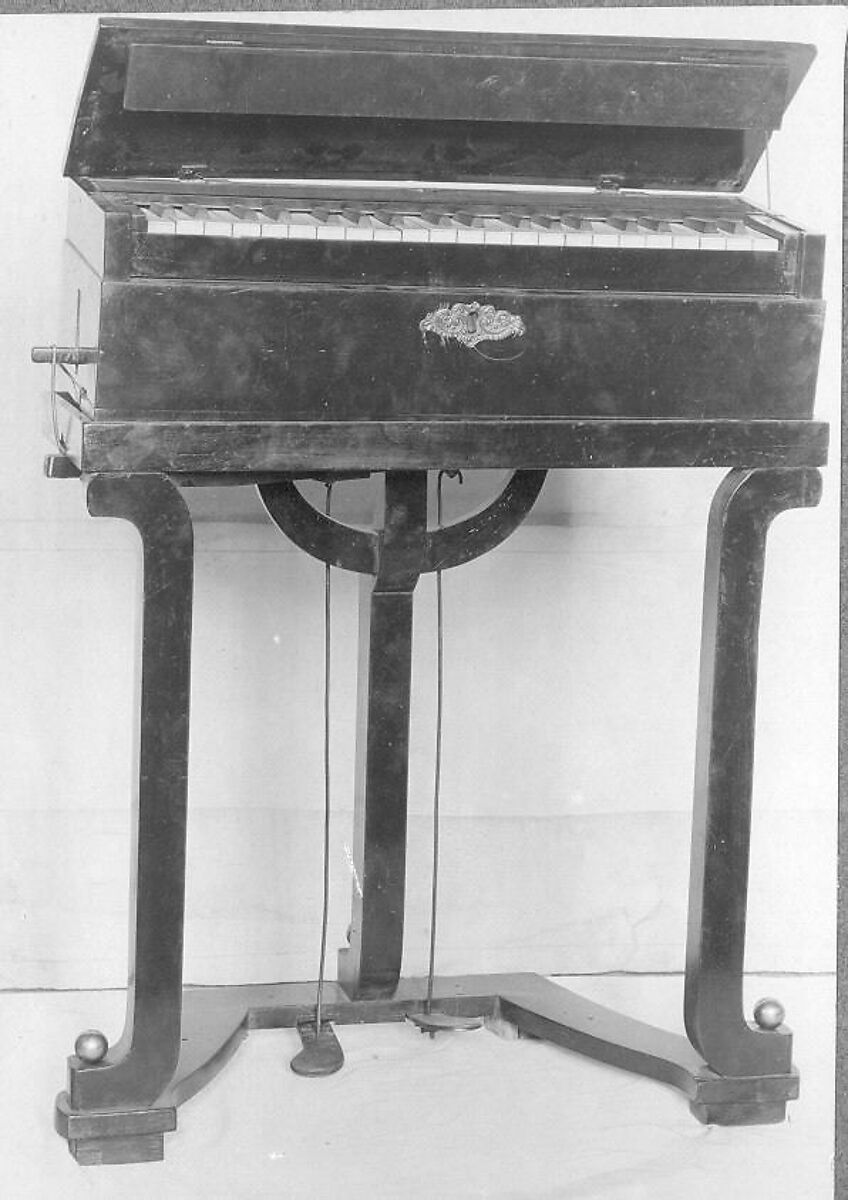 Technical description: Rectangular mahogany veneer case latched on a shallow tray above a three-legged stand holding two pedals (left operates lever within windchest that partially blocks wind supply for softening effect; right operates bellows through linkage to lever extending from left end of case)