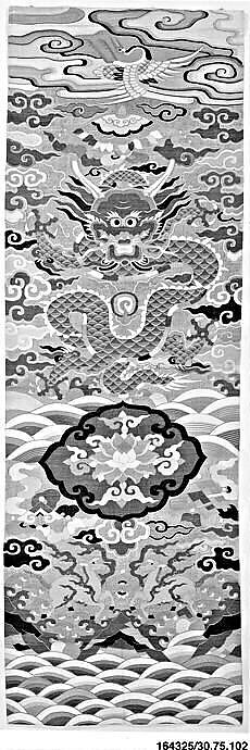 Unlike upholstered furniture, chairs in China were covered only temporarily with textiles, such as this silk tapestry (kesi) chair strip, designed and woven specifically as a chair covering. The lobed floral medallion was positioned on the seat of the chair, and the four-clawed dragon (mang) adorned the back. At the top of the strip, the crane is upside down because that short portion was meant to hang down behind the chair.