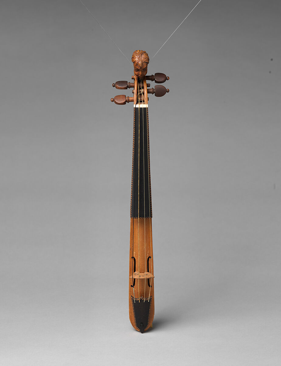 Description: Boat-shaped case, the fluted back and sides of seven strips of wood, with inlaid ivory lines; below the tailpiece a carved angel's head; light varnish; long C-shaped soundholes; ebony tailpiece inlaid with colored woods; the neck of ebony, similarly inlaid, four strings; pegbox decorated with carving and terminating in a human head.