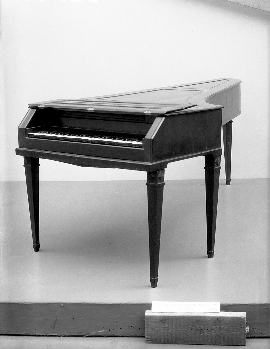 Technical description: mahogany and crossbanded mahogany veneer case on four square, tapered legs; panel and frame lid; wrestplank of beech, veneered; unpierced tuning pins; soundboard not laminated; compass FF-f3 (61 keys), ivory naturals with black-painted molded fronts, ebony slips over black-stained accidental blocks; 1 knee lever, operable by either knee, lifting dampers by raising rack in which they are suspended; German action with escapement, no check; damper jacks guided by wood and leather rack over strings, jacks cylindrical for bottom 2/3 of length, cylinders passing through holes in leather lower guide and resting on leather-lined wood blocks glued to key levers; double strung throughout, none wound. (L. Libin 1976)