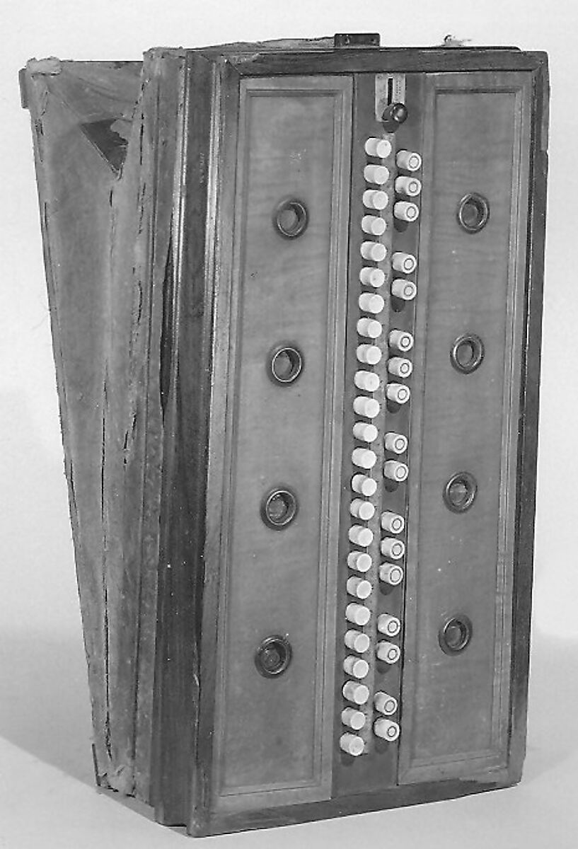 The "rocking" melodeon or organ received this moniker because it had to be pumped up and down (the keyboard therefore rocking) in order to pump the bellows to sound the reeds. The instrument was typically set on a table to play. Instead of keys, this instrument has two rows of buttons. These buttons are in an arrangement like a traditional keyboard, with a row of naturals and a second row of accidentals arranged in alternating groups of two'ss and three's.