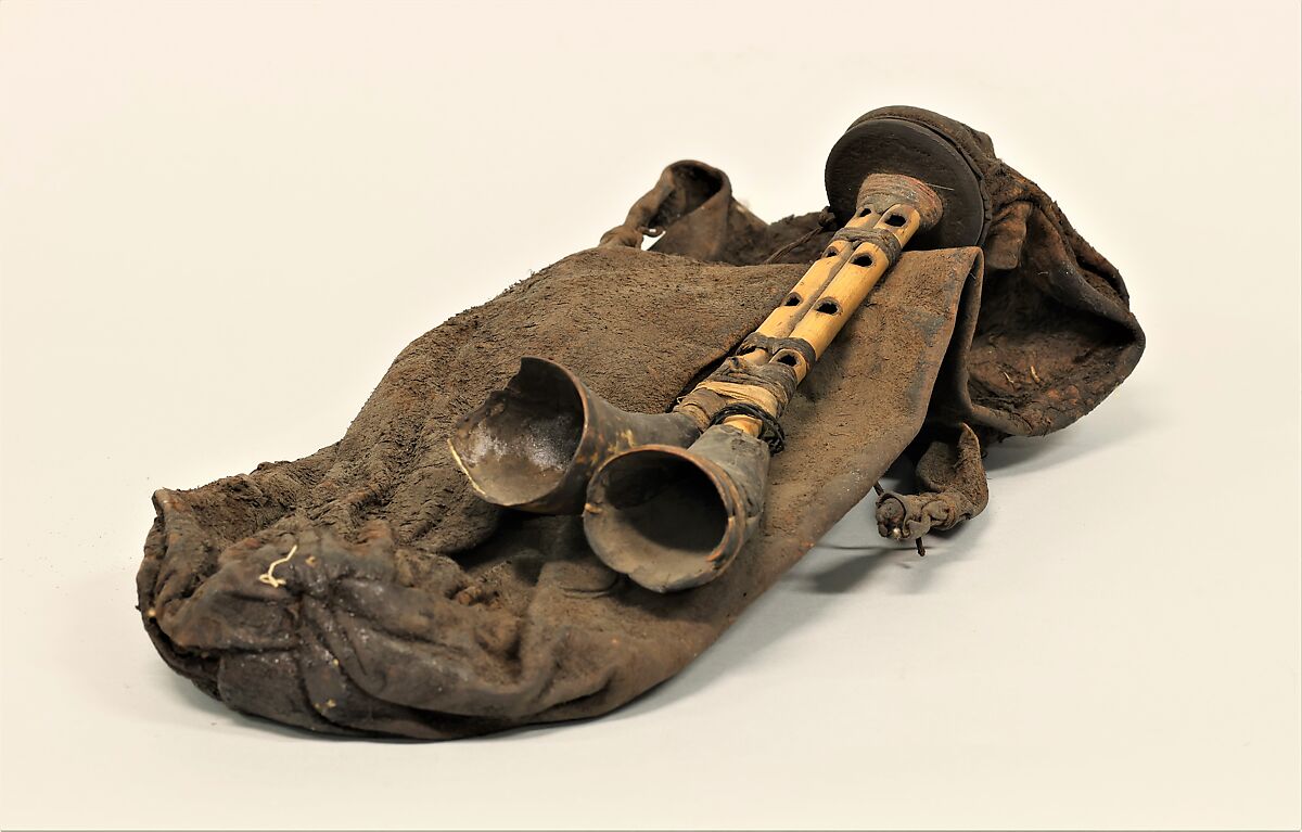 The zuqqara is an instrument found across Northern Africa. Alternative names include zokra, zoukra (Libya), mezwed, mizwid, mezoud (Tunisia) or chekwa (Algeria). This instrument was bought from an itinerant musician in Egypt in 1902 by Mr. Daoud Tekla, the American Consul of Aswan. The instrument features two parallel melodic pipes with five fingerholes on each pipe, ended by two horns. Most likely made by the musician himself, the fingerholes are roughly cut, and one can still make out the knife marks around the fingerholes. This suggests that this instrument was quickly made by someone who was experienced and needed a functional instrument rather than an expertly finished one. The discrepancy between the turned blowpipe and the simplicity of the bag and chanter also points to the fact that the blowpipe was probably borrowed from another instrument. This is a common occurrence in these kind of multipart instruments, where functional pieces are re-used to make new instruments.