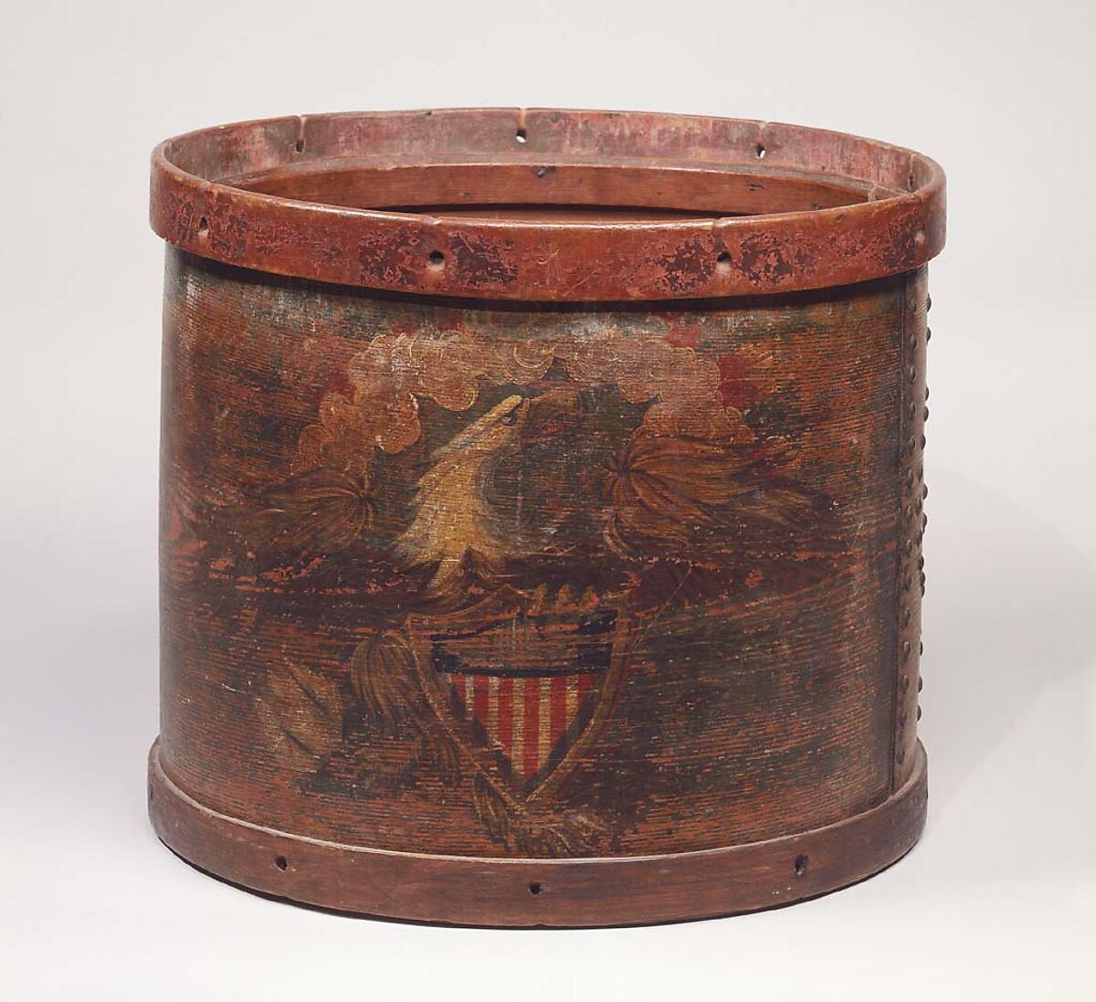 At the time this drum was made, eagles were popular decorations among patriotic Americans and could be found, as a symbol of national pride, on many objects. Drums especially, because of their use in the military, were often decorated with eagles from the very earliest days of the United States. The eagle with a shield would become a standardized decoration of U.S. military drums in the middle of the 19th century and was used on Union drums during the Civil War.