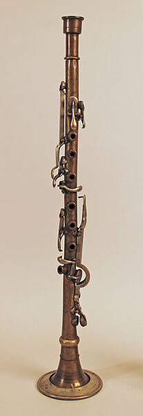 Technical description: Brass ‘skeleton’ body with German silver keywork. One piece body. All tone holes have chimneys. No key for F4/ C6. Straight speaker, speaker liner projects almost to the centre of the bore. Shaped thumb rest. No guidance for F♯3/C♯5 lever.