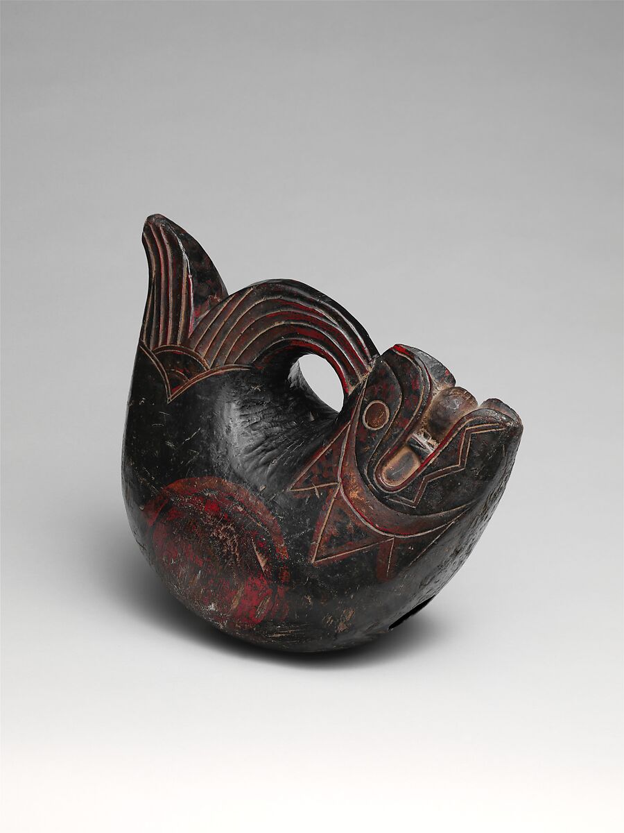The fish is a Buddhist symbol of watchfulness, reflecting a belief that the fish never sleeps. This state of wakeful awareness is reinforced by the hollow sound of the muyu, a fish-shaped slit drum used to accompany Buddhist chant. Laid flat and struck on the red circle with a mallet in measured beats, this version, from Yunnan Province, is a less abstract rendering than most temple instruments. The muyu may also be found in vocal and instrumental ensembles of Guangzhou