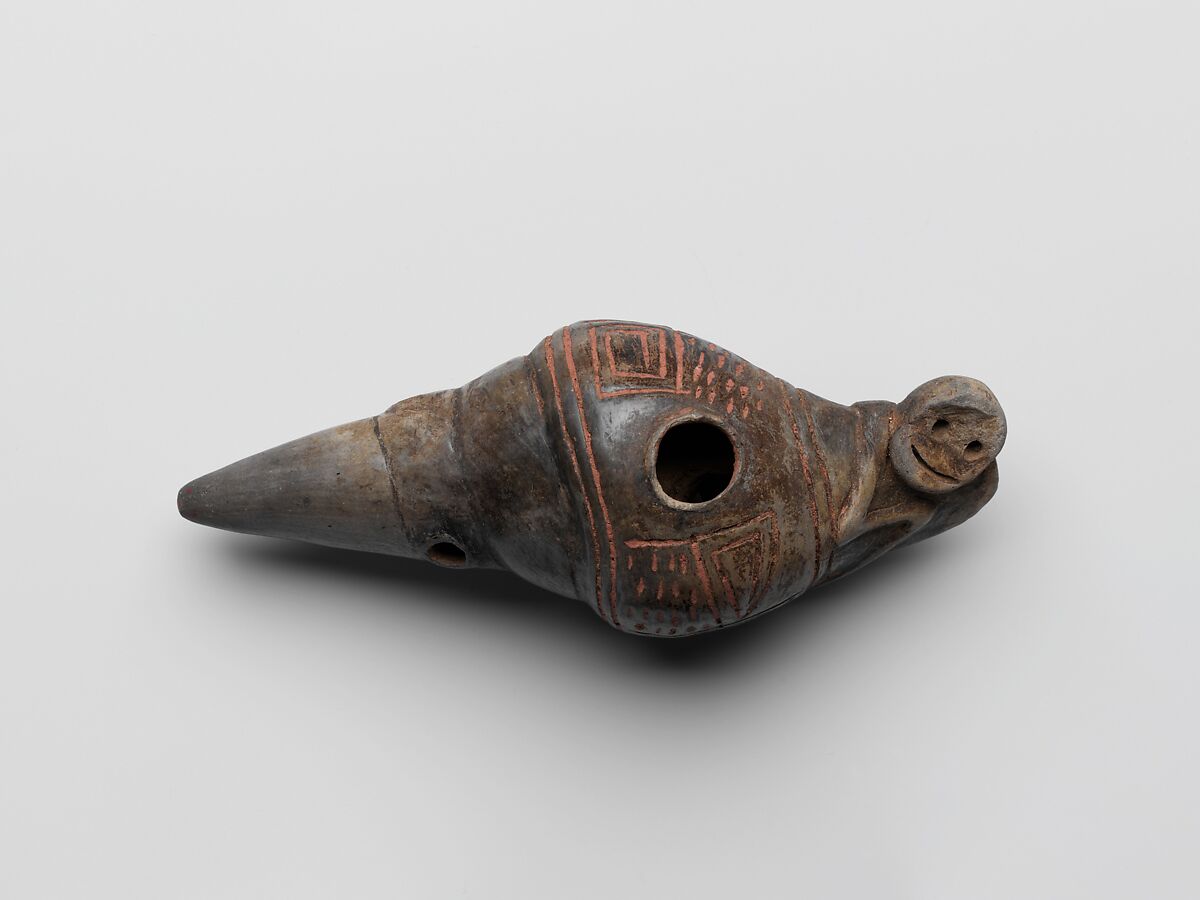 Description: Conical, shell-shaped black-on-red ceramic vessel pointed at one end with two fingerholes, blowhole on upper side of globular section with thumbhole in back and monkey final crowning globular section; produces four tones; incised area of red in circumferential lines and geometric designs.