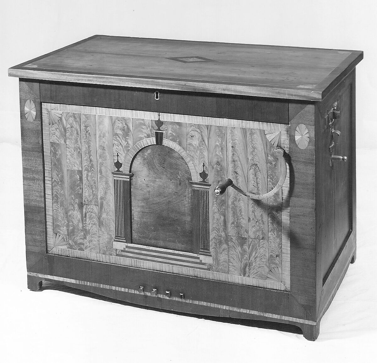 Technical description: Rectangular cherry and satinwood veneered case with inlay showing a classical portal on the front panel; lid hinges up to reveal mechanism; door on left side allows barrel to slide out; several different layers of floral design colored paper cover interior case sides and reservoir top; lid locks to front, with keyhole above portal; four brass stop knobs (two missing) operate stop levers extending through front panel, bottom, and 16 tunes are selected by engaging notches on shift pin with a latch mounted on right side; curved crank with wood handle protrudes near upper right side of front; within, the crank turns a combination worm and crank shaft, the worm engaging a spur gear on a cylindrical, brass-pinned wood barrel, while crank shaft operates two double fold feeders mounted below a reservoir; feeders and reservoir covered with brown leather; 17 sticker pins open valves in windchest below 3 ranks of wood pipes (lowest pipes mitered, pipes mainly open with tin tuning flaps, but lowest pipes stopped), and six other pipes are set horizontally into a windchest in front of the barrel and are operated by pressing 6 buttons near the front left corner inside the case (four of these pipes are open wood, two are single beating reed with cane reeds lapped with thread onto shallots); compass two octaves diatonic, D-D, plus upper C#; pipes marked with letter names and numbers; titles of tunes shown on handwritten label on sliding panel mounted in a box at right side within case.