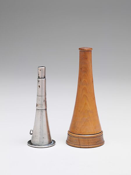 2007.338.1a, b: Mouthpiece for French horn, with wooden container. French type mouthpiece, soldered from thick sheet metal (silver or silver plated brass), and an embouchure ring on top. At a later date, the stem was fitted with a sleeve to make it fit snugly to a wider mouth pipe. There is a small lateral loop for a chain or string. The container of boxwood, approximately in the shape of a cone and to be closed with a screw cap, may be a later addition. Length of the mouthpiece 6.4 cm (2-1/2 in.), bore 11.7 cm ( 4-5/8 in.). Height of the container 9 cm (3-5/8 in.)