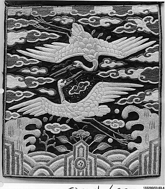Rank badges embroidered with one or two cranes flying among clouds were reserved for civil, rather than military, officials. Usually woven of colorful threads, the design here has a limited two-tone palette of white and green-blue. Such badges were usually worn during the one hundred days after the three-year mourning period following the death of a king or queen.