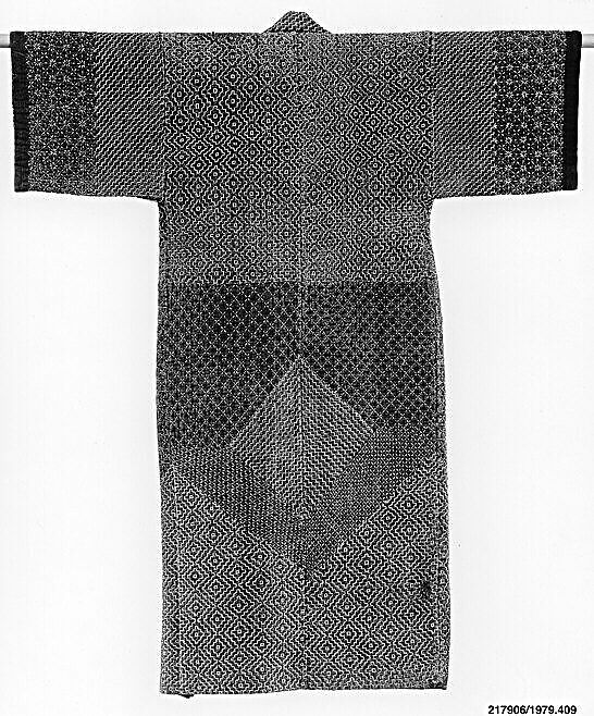 This robe features seven continuous patterns. Some geometric patterns used in sashiko are stylizations of floral themes, such as the kaki no hana (persimmon flower) design seen at the shoulders and hemline.