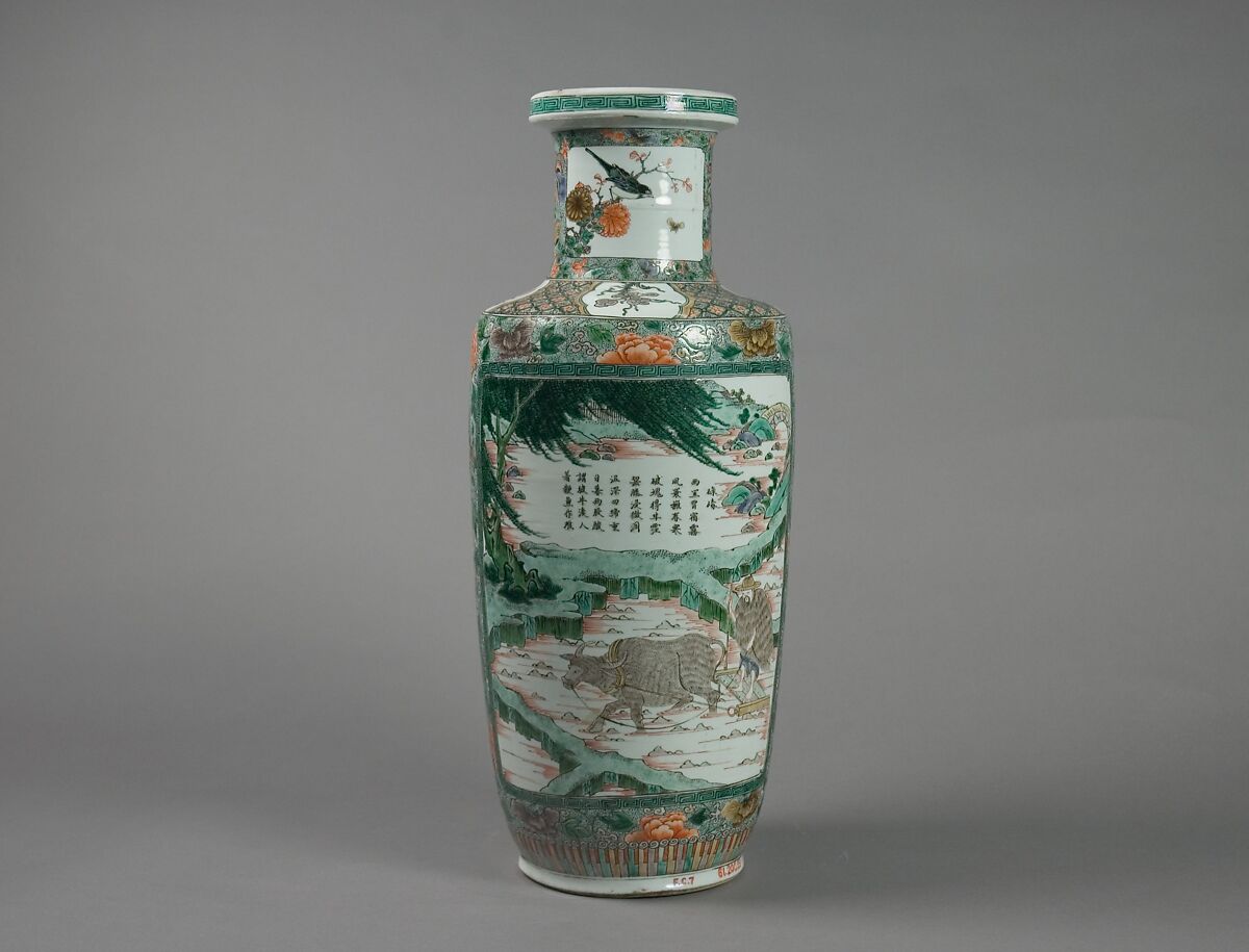 Rice farming and silk production, both represented here, were cornerstones of agrarian society in premodern China. Woodcuts made after imperial court paintings based on the twelfth-century text Farming and Weaving (Geng Zhi Tu) were widely used as models for artworks in other media, such as this vase. The headings of the texts on the front and back sides of the vase are “flattening rice paddy” (ludu) and “shelving silkworm cocoons” (shangcu).