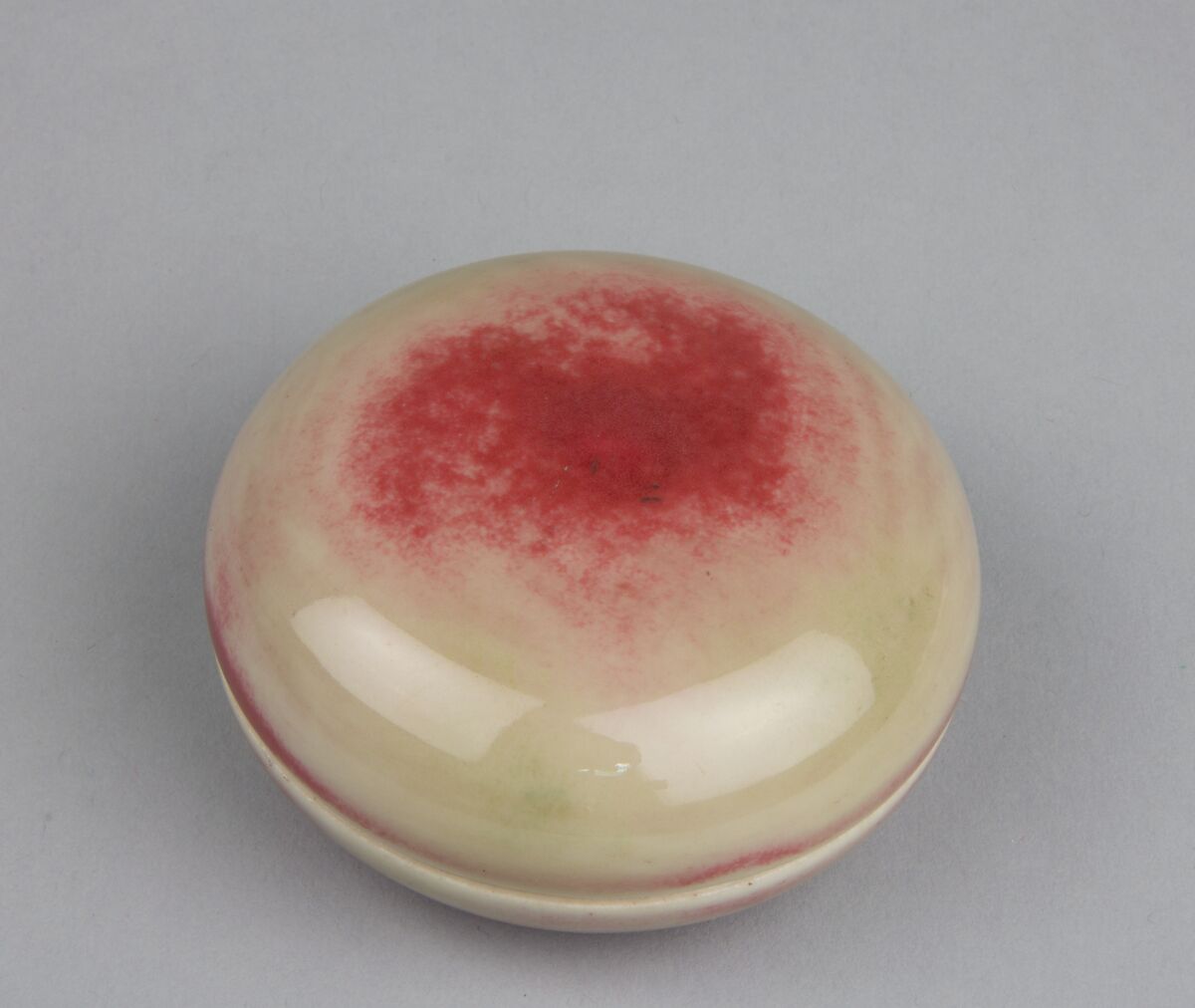 - Medium: Porcelain with peachbloom glaze and pink and green coloring