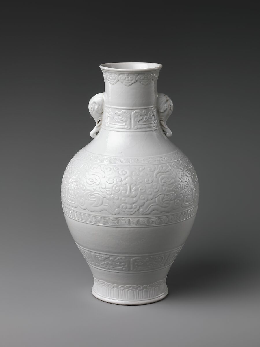 In the eighteenth century, the kilns at Jingdezhen began to make porcelains of a different material. Known as huashi, or "slippery stone," this expensive material, often called soft paste, was used to make thin vessels that frequently were decorated with incised or raised designs under glaze. While the reasons for its introduction remain unclear, it is worth noting that soft paste is easily carvable, and its use would have thus been akin to contemporaneous interests in the manipulation of other materials such as ivory and bamboo. The shape of this vase is loosely based on Bronze Age vessels whose handles were shaped like the heads of animals.
