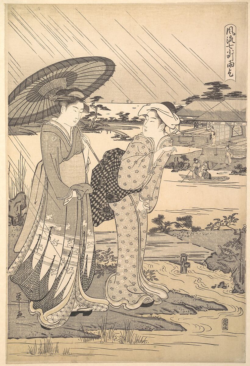 In this sophisticated image of beauties enjoying an outing, the original content of the theme is intentionally obscured. Only the rain and the small boat in the distance refer to the Kabuki play Komachi Praying for Rain. The lushness of the summer scene and the fresh beauty of the women are subtly enhanced by the avoidance of color in the monochrome print.