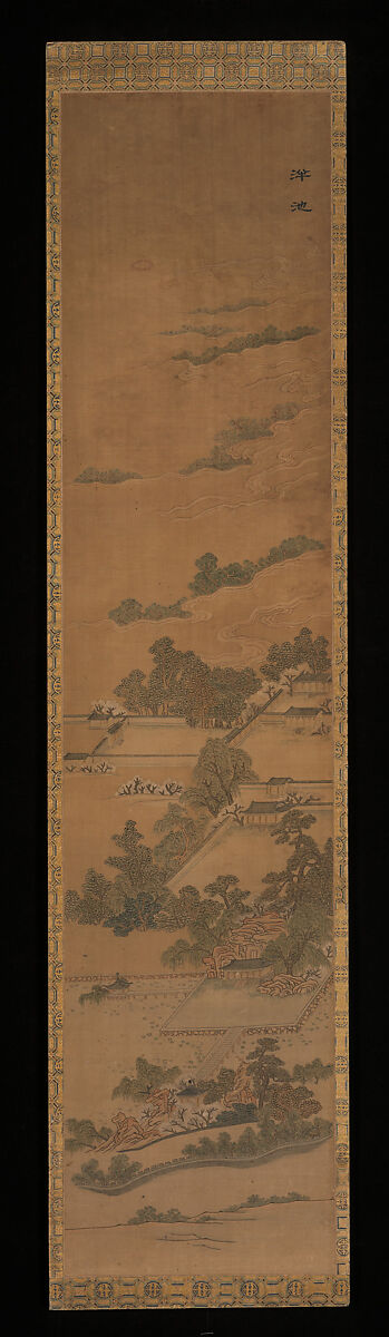 These four tapestry hangings (13.220.134–.137) may be from a larger group depicting the scenic sites that the Qianlong Emperor (r. 1736–95) visited during his historic tours south of the capital. The inscriptions identify these four places as Forest of Springs (Quanlin), Pool of the Ancient School (Panchi), Guangyue Tower (Guangyuelou), and Wuwei Monastery (Wuweiguan), all now in Shandong Province. Aside from Guangyue Tower, the buildings at the other three sites have been destroyed, though the first two are known to have housed auxiliary palaces. The images on these panels are comparable to woodblock illustrations in Nanxun Shengdian, a book published in 1770 to memorize the emperor’s tours.