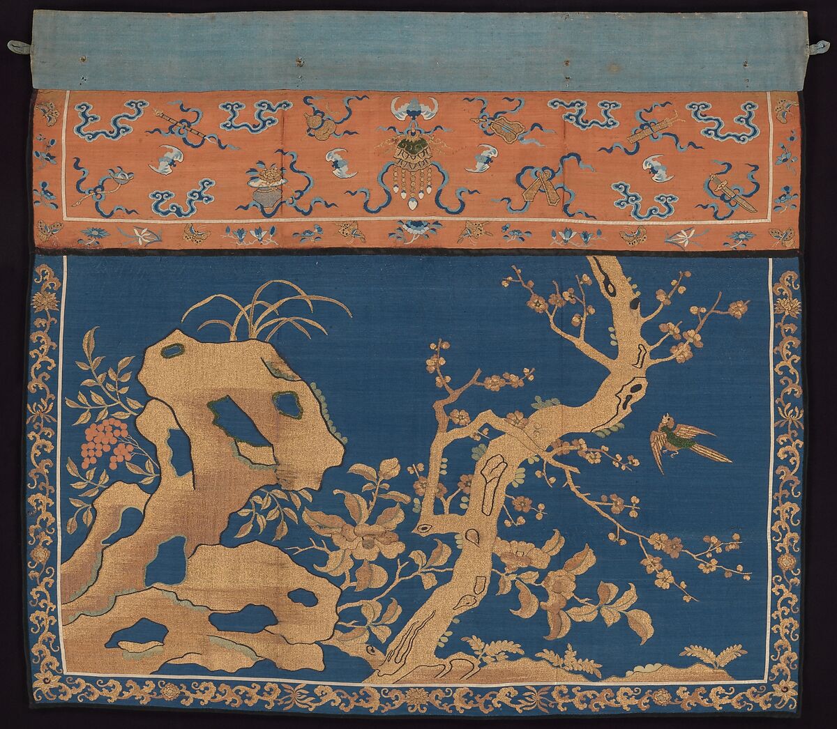 Among the winter plants in this table frontal’s main decorative area are camellias, nandina berries, and a blossoming tree, perhaps a wax plum (lamei), all woven largely with metallic thread. The impressive rock on the left suggests that the scene is a close-up of a carefully cultivated garden. Like its autumnal counterpart, also exhibited here, this valance features an overhanging top register with the attributes of the Eight Daoist Immortals.