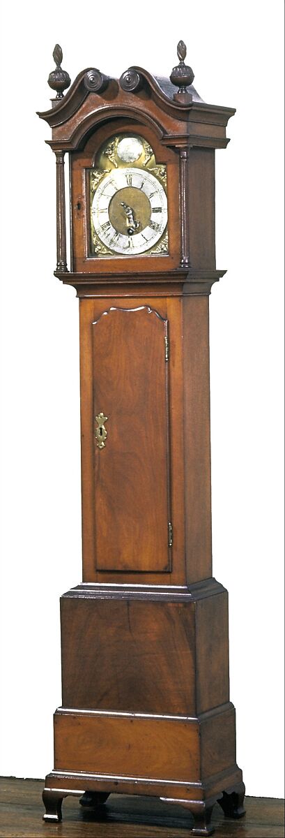 There are only ten known clock movements signed by Thomas Claggett. Of these only the dials on this clock and one now at Winterthur are alike, both featuring the type of spandrels common on late seventeenth-century English clocks. The cases of the two clocks are smaller than standard size, but larger than most miniature versions, and each has a separate bonnet with a hinged glazed door, typical of full-size tall clocks. This case matches the archetypal housing for Claggett's earlier clocks.