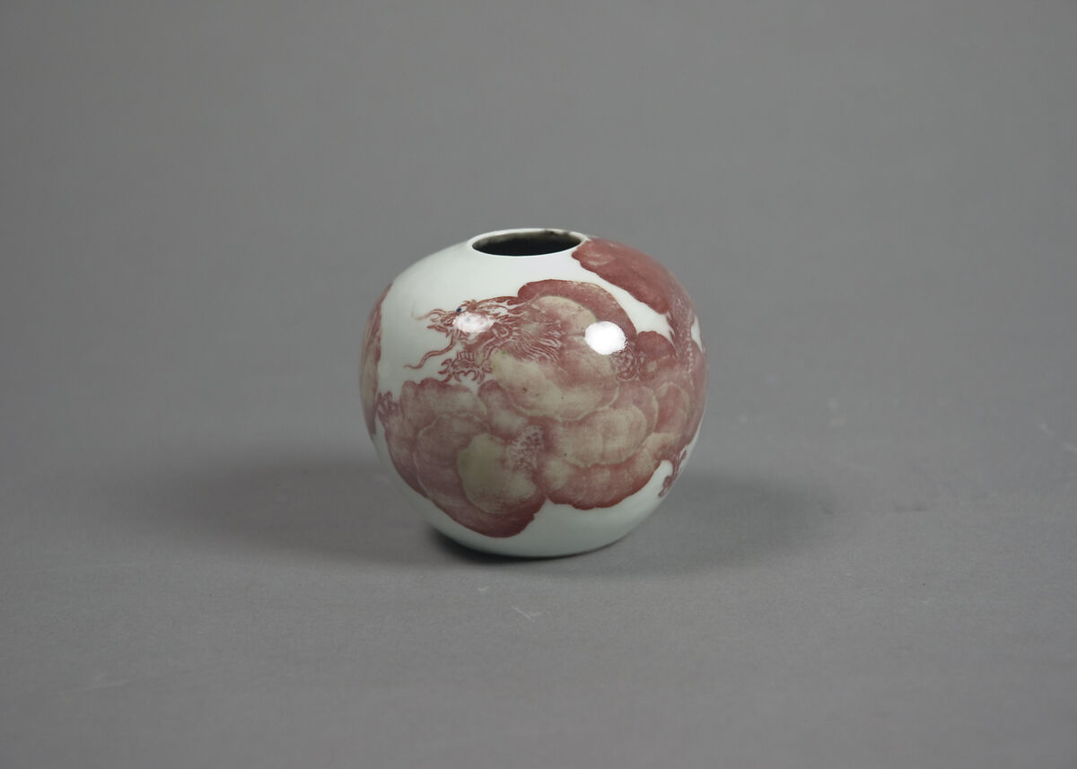 This water pot was most likely used while writing with a brush and ink. The dragon coiling around the surface was painted in an intentionally murky fashion, creating the impression that the dragon is at a distance or flying through a cloudy sky.