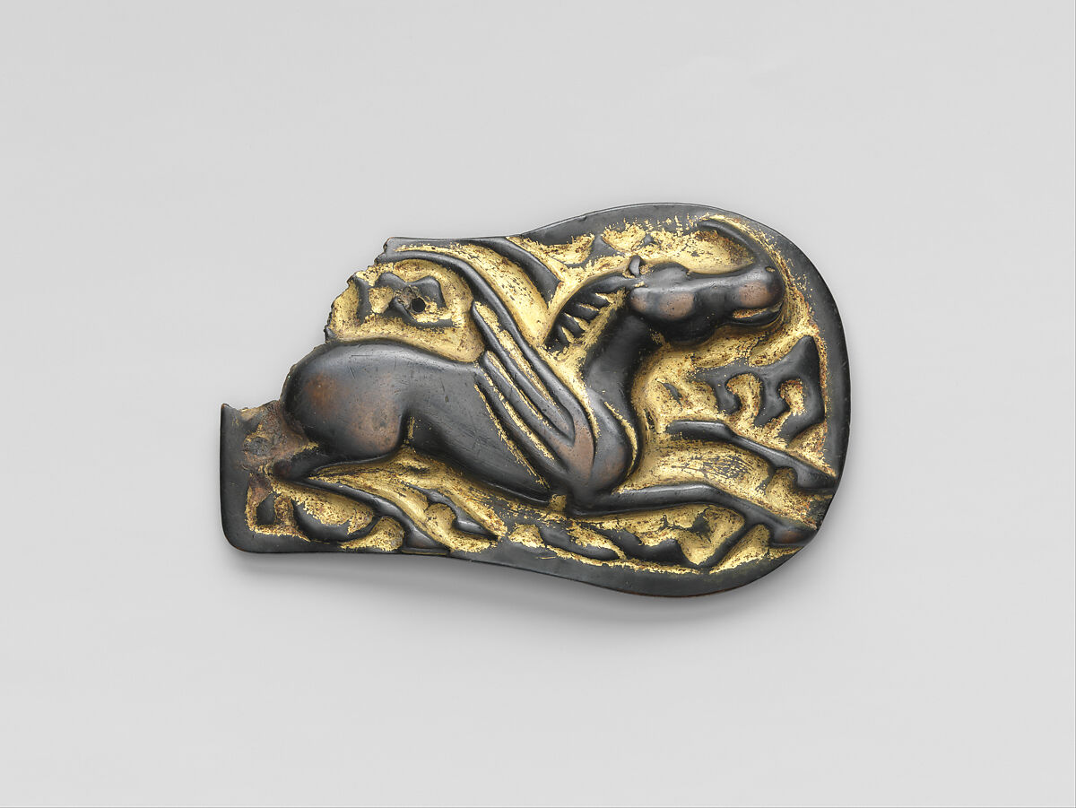 This pair of plaques once adorned a leather belt belonging to a member of a nomadic community, likely the Xianbei, that migrated seasonally across the Eurasian continent. The winged horses may represent the “heavenly beasts” of Xianbei legend. These mythical creatures were believed to have originated in the steppes.