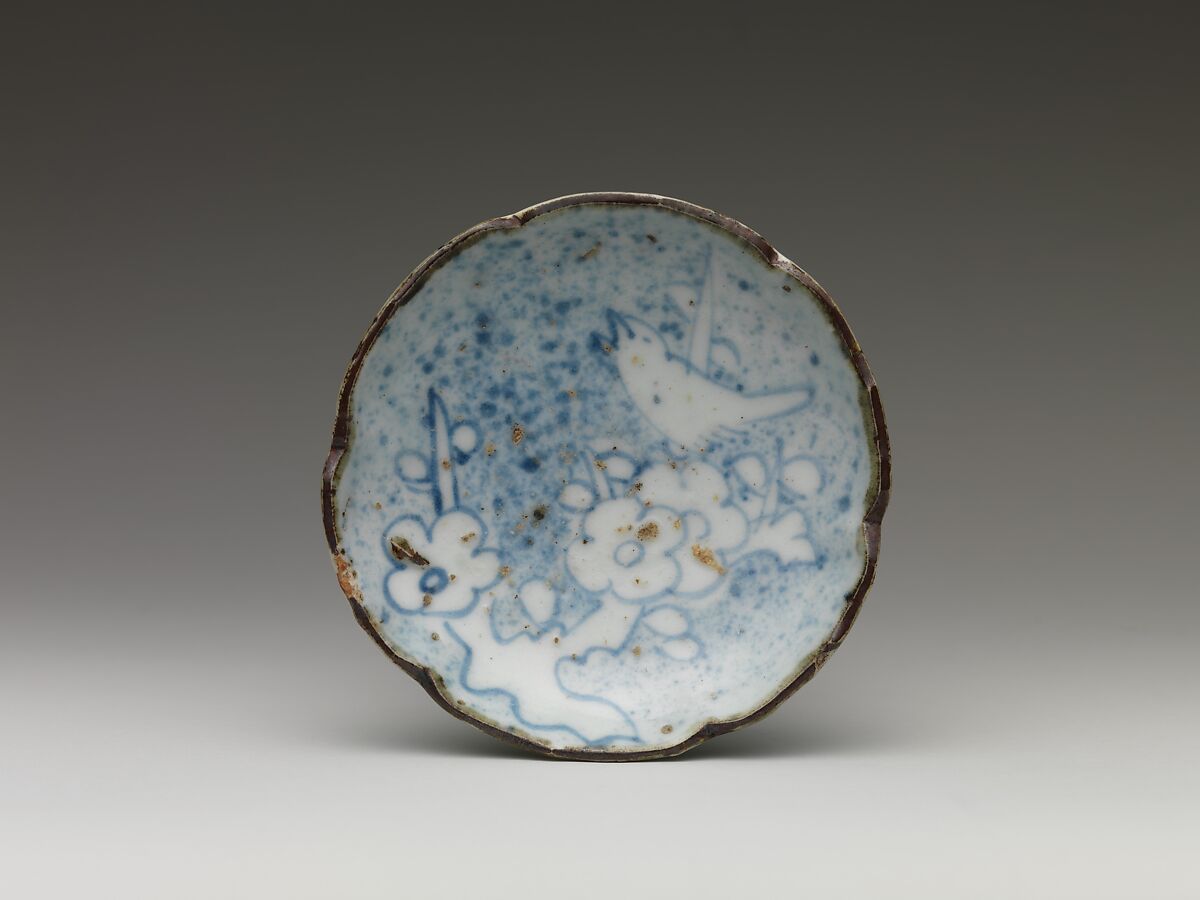 This set of small dishes represents the early phase of blue-and-white porcelain production in Arita. The painterly design of blossoming plum branches and a warbler may allude to the chapter “The Warbler’s First Song” in The Tale of Genji, which is associated with New Year’s celebrations—a notable depiction of a distinctly Japanese subject in Early Imari ware.