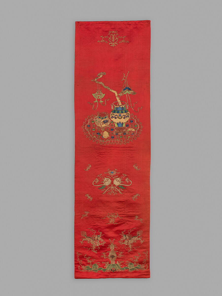 Unlike upholstered furniture, chairs in China were covered only temporarily with textiles such as this chair strip, designed and embroidered specifically to be used as a chair covering. The antiquities in the design are rebuses for good wishes. For example, the halberd and the angled stone chime together form the rebus for "celebratory occasion." This strip is embroidered mainly with gold threads that have been couched-that is, laid on the surface of the satin and stitched into place.