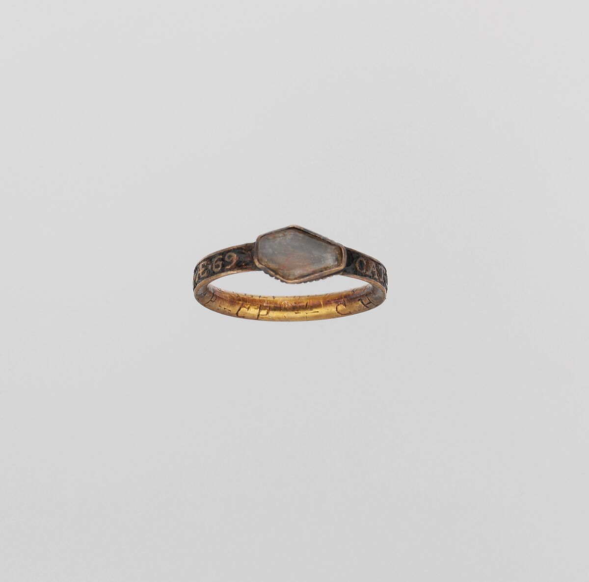 Mourning jewelry—jewelry that commemorates the dead—was commonly commissioned by early American colonists upon the loss of friends or loved ones. On this ring gold letters highlighted by black enamel wrap around the band and spell out "CAT.D.PEYSTER: OB 8. DEC. 1733 AE 69." The band supports a bezel containing a coffin-shaped cut glass. A piece of human hair, most likely belonging to the deceased, is visible below. Another inscription is present on the inside of the band, and reads "ADP * obiit 2 Aug * 1728 AE 71." The two obituaries likely refer to Abraham and Catherine De Peyster, a prominent New Amsterdam couple. While mourning rings featuring 'memento mori' symbols, such as coffins, skeletons, or hourglasses, were popular through the mid-eighteenth century, eventually more euphemistic imagery, such as weeping willow trees and draped urns, became more standard iconographical motifs in mourning jewelry.