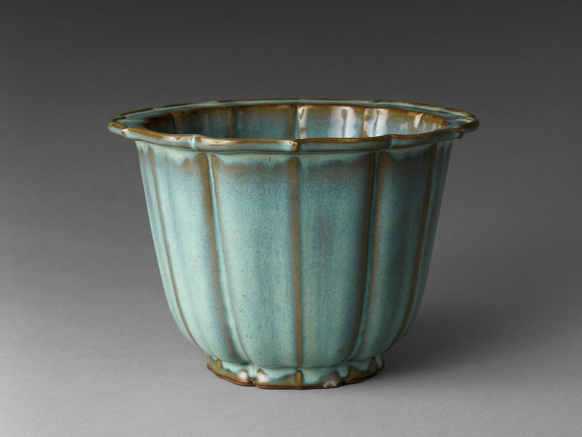 - Medium: Stoneware with splashed blue glaze (Jun ware)