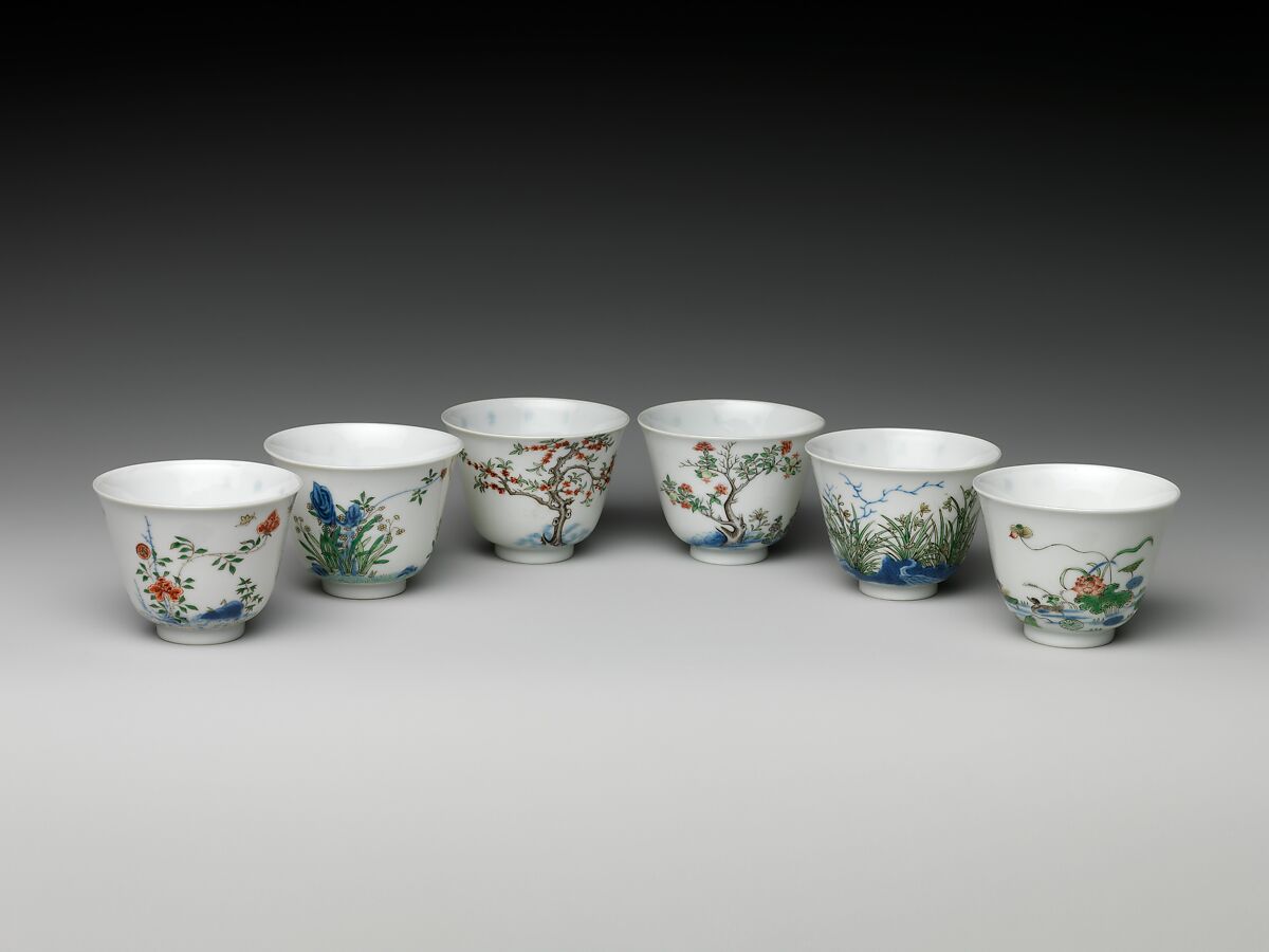 Known as "monthly flower cups," this type of cup set is highly appreciated as one of the finest imperial Qing porcelains. The flowers of the twelve lunar months are winter jasmine, apricot, peach, tree peony, pomegranate, lotus, orchid, sweet Osmanthus, chrysanthemum, Chinese rose, plum, and narcissus. The poems on the backs of the objects, mainly derived from famous Tang-dynasty (618–907) poems, appraise the values associated with these flowers.