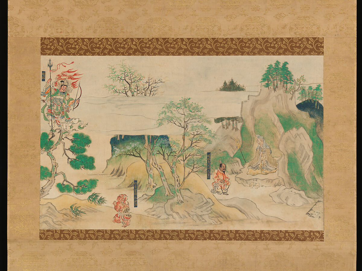 Jin’ōji Temple is associated with the ascetic hermit monk En no Gyōja. Legend has it that he ordered a shikigami (a local deity represented as a small ghost) to guide the Korean deity Hōshō Gongen (Korean: Boseung gwanhyeon) to Jin’ōji. Here, Hōshō Gongen appears as an armed guardian atop a pine tree, while one of the monk’s servant-demons kneels before him in adoration.
