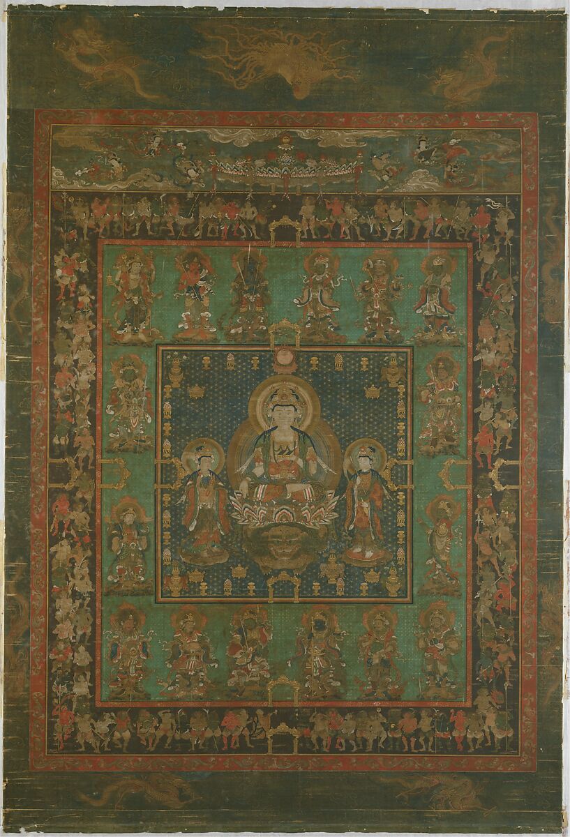 The mandala imagines a tiered space with a series of gates leading from the outside in through increasingly sacred registers. A monk near a gate at the bottom is a reminder of the material world. At the periphery are dragons, a phoenix, and apsaras playing music. Dozens of demigods in the gray register serve as protectors of the Sixteen Benevolent Deities in the green area, and the holiest sector features the central triad on a blue platform.