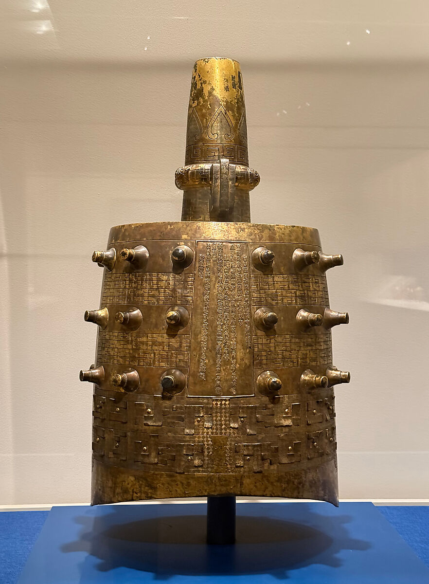 In 1761, the Qianlong emperor ordered the casting of twelve-piece sets of gilt bronze bells based on recently discovered ancient bells from Jiangxi. Whereas the sixteen-bell chime sets were played together, each bell in the new set was played on its own, only during its corresponding month, such as the one here for the third lunar month. It would be struck once to announce the start of movements of the state ritual music Melody of Harmony.