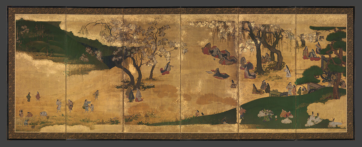 Outings to enjoy blossoming cherry trees and the turning colors of maple leaves have been cherished seasonal activities in Japan since ancient times. In the screen at right, where spring cherry blossoms are at their peak, aristocratic women have arrived by carriage. The ladies, with their long hair and voluminous silk garments, look almost anachronistic, while the men, other women, and children are dressed in colorful contemporary fashion. A lady of the palace sits composing a poem while her attendants relax, some enjoying sake.