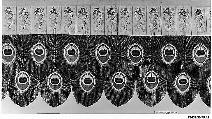 - Medium: Silk, metallic thread, and peacock feather embroidery on silk satin