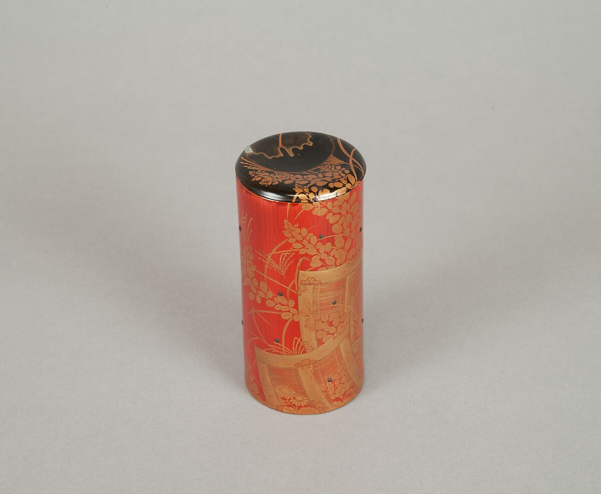 This box probably held a tea whisk. The designs are of the autumn grass hagi (bush clover), susuki (acanthus plants) with dew, and bamboo blinds. A half-moon is encrusted in pewter on the black-lacquered lid. These motifs evoke an episode in Chapter 10 of the Tale of Genji, "The Sacred Tree" (Sakaki), in which Genji visits the Rokujo Lady at Nonomiya Shrine before she leaves Kyoto to accompany her princess at the Ise Shrine.