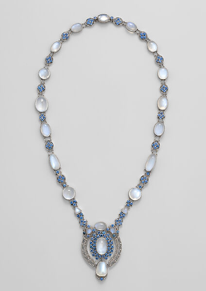 Tiffany made a series of jewelry designs composed of moonstones and sparkling Montana sapphires set in platinum. This necklace, one of the most elaborate extant examples, features moonstones of irregular size and shape interspersed with a design of twisted scrolls, each enclosing four tiny sapphires. The piece could be worn as one large elaborate necklace with pendant, as seen here, or it could be separated into discrete items and worn as a choker or a bracelet, with the pendant as an independent brooch. The piece was given to the Museum by Susan Dwight Bliss, a long-standing patron.