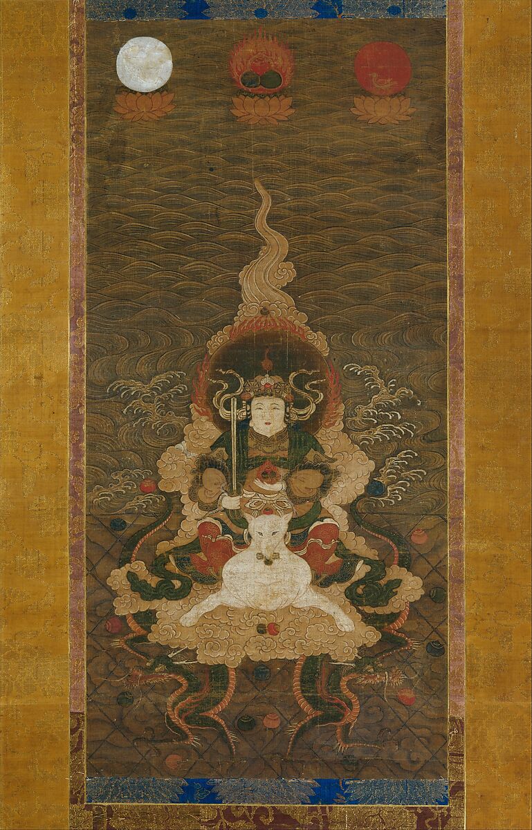 Dressed in Chinese courtly attire, Dakini sits astride a fox on a cloud held aloft by dragons and grasps a vajra sword and sacred jewels. An ancient Hindu deity, Dakini was originally a man-eating demoness transformed by the Buddha Mahavairocana (Dainichi Nyorai) into a life-engendering divinity. She embodies powers of fertility that were invoked for imperial enthronement rituals in the Kyoto court, which led to her assimilation with the ancient Shinto fox deity, Inari.
