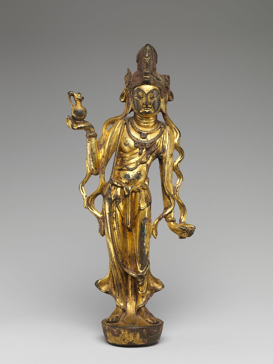 This bodhisattva can be identified as Avalokiteshvara by the small sculpture of a Buddha on his headdress and by the vessel he holds in his right hand. The shape of this vessel, particularly its bird’s-head top, typifies metalwork and ceramics produced in China in the late seventh and early eighth centuries.