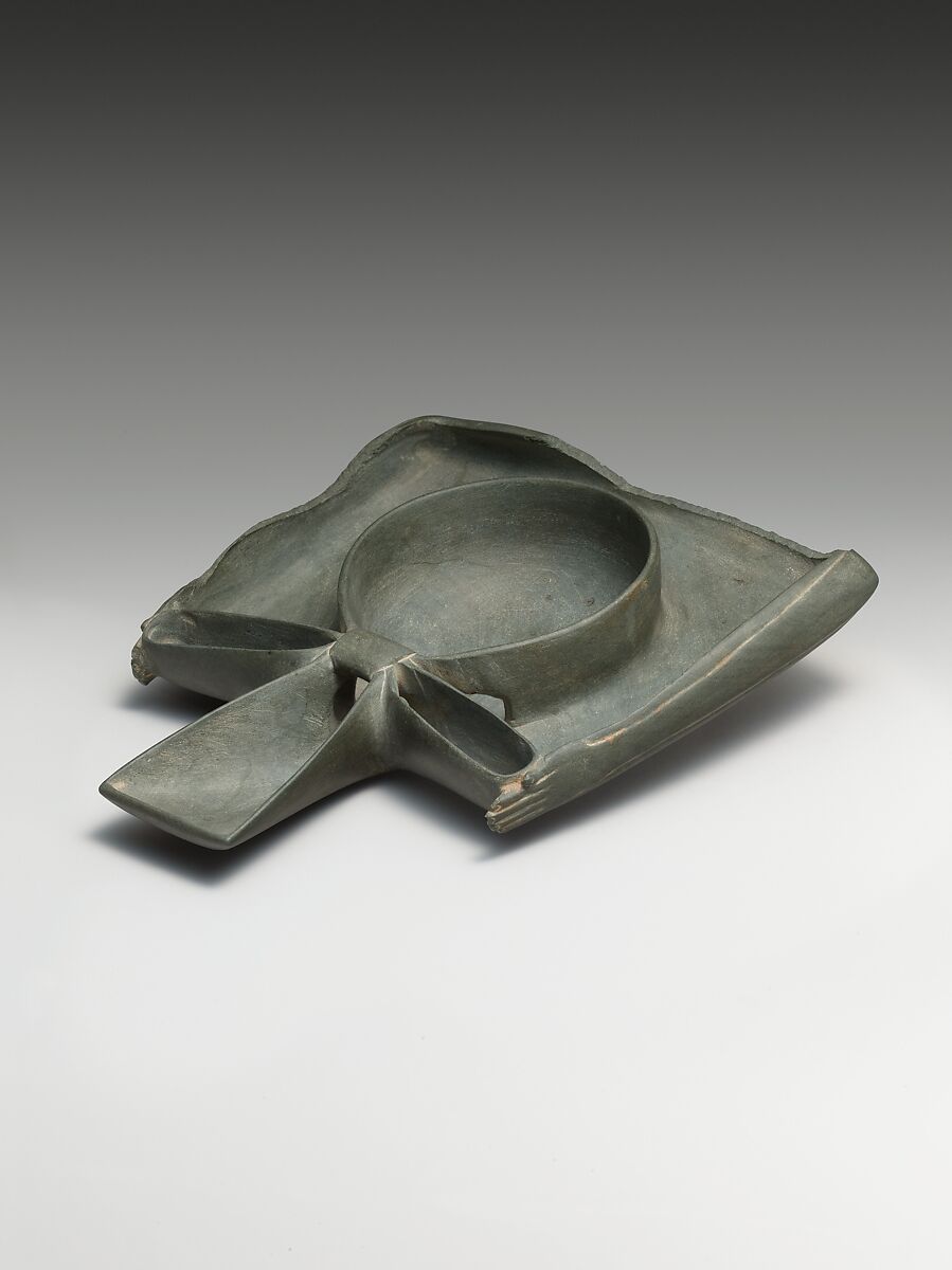 This masterpiece of Early Dynastic stone carving has the shape of two intricately linked hieroglyphs. The two bent arms that frame three sides of the dish are read "ka," the word for "spirit" in ancient Egyptian. The loop and knot are read "ankh," meaning "life," or "to live." The combination could be interpreted as the phrase "life to thy spirit" or as the name of a person, Ankh-ka. The dish was undoubtedly used to pour a purifying liquid, probably water, that would take on the magical significance of the hieroglyphs.