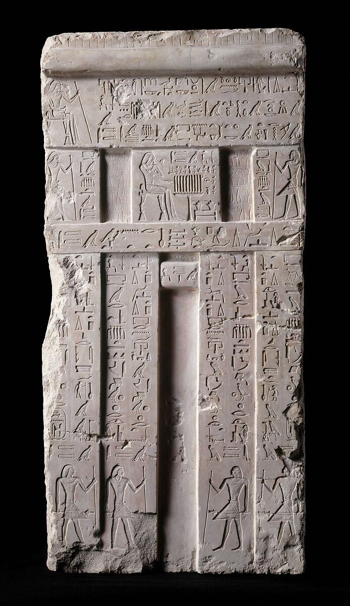 Metjetji had himself depicted no fewer than eight times on his false door. In the offering scene just above the door recess, he sits in front of an offering table with a large stock of unguent jars arranged for his use in sunken panels on either side.