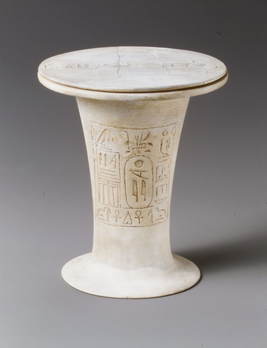 This ointment jar was probably valued more for its inscription than for the perfumed oil or unguents it contained. With a wide rim and flat foot, the vessel has a disk shaped lid with a circular protuberance on the inside. Such receptacles were common from the Fifth to the Eleventh Dynasty. Many similar jars bear inscriptions that mention the celebration of the royal jubilee (Sed festival) have been found, most of which date to the Sixth Dynasty. This jar bears the name of Pepi I and mentions the first celebration of his Sed festival, which seem to have taken place in the eighteenth year of his reign. Such jars were most likely given as royal gifts, underscoring the king’s preeminence, but also distinguishing the person to whom they were presented.