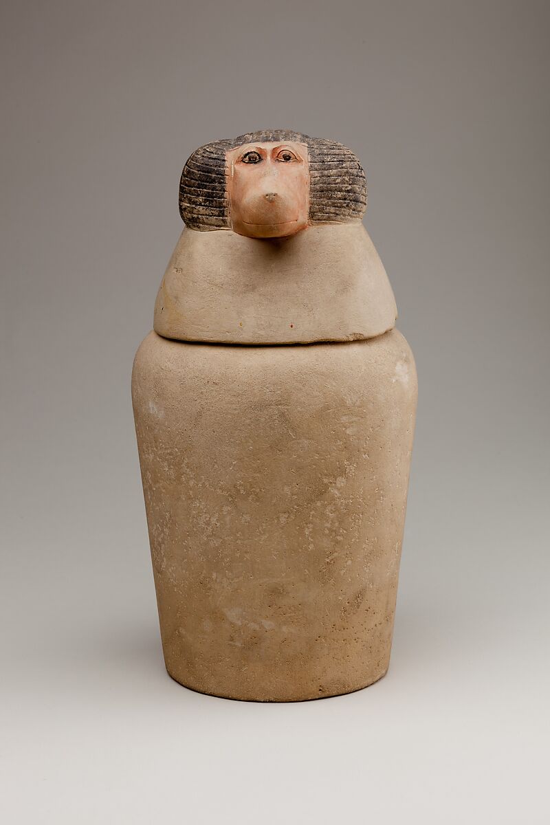 Canopic jars were made to hold the internal organs that were removed during mummification. This canopic jar, with its baboon-headed lid, probably held the lungs and was under the protection of the god Hapy, one of the Four Sons of Horus. The other three jars of the set are 12.183.1a, c,d.