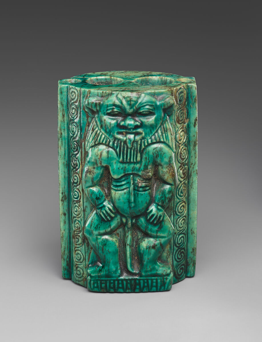 On this green kohl tube is the image of the god Bes, whose gruesome figure was meant to repel the supernatural forces believed to cause eye disease.