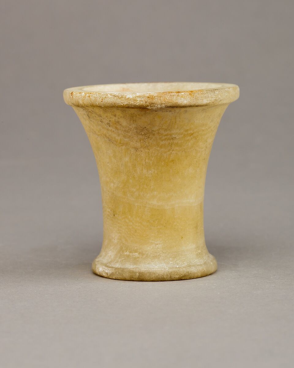 This small ointment jar was part of a foundation deposit comprising 25 vessels of pottery and Egyptian alabaster, 1 stone burnisher of Egyptian alabaster, and 10 rough grinders of sandstone. The deposit was discovered in a pit along the axis of the pyramid temple of Amenemhat I at Lisht North, where it had been buried during rituals performed by the king to mark the beginning of the temple's construction.