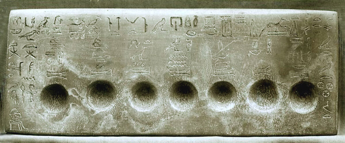 The slab is provided with seven circular depressions for the "seven sacred oils" that were used in mortuary rituals. The names of the oils are written above the hollows. The signs are delicately incised, but then less carefully covered with green pigment, much of which remains. Above the labes is a horizontal line of inscription asking that offerings be made for the owner of the slab, a nobleman named Ankhwadjes.