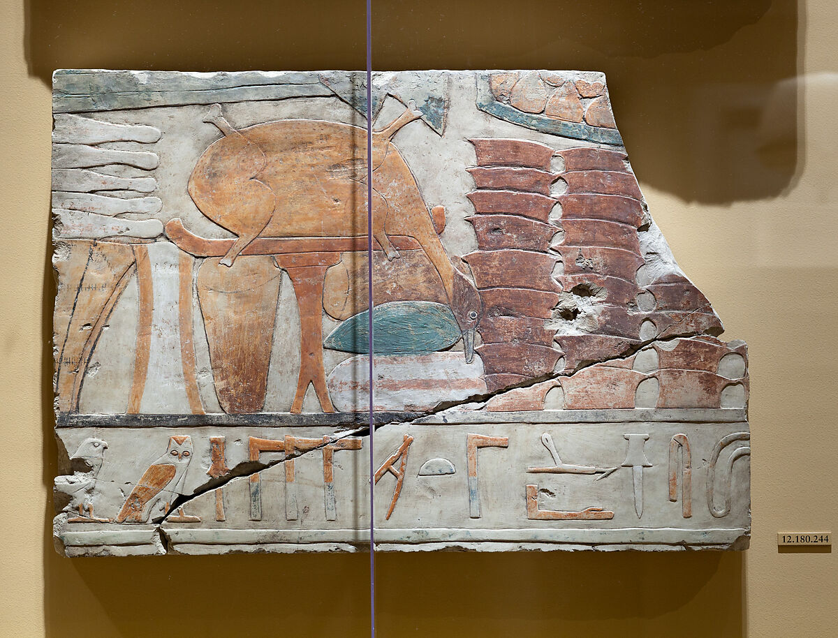 The original colors are very well-preserved on this block, which depicts offerings that were piled in front of a now-missing figure of the tomb owner at his funerary banquet. Visible here are figs in a basket, molds for baking bread, a huge goose, and meat and vegetables topped by two papyrus plants. The inscription below provides a partial list of Dagi’s titles: “sealer [of the king of Lower Egypt], sole companion, favorite of the god, director of those who are among the gods, [. . .] of Horus.”