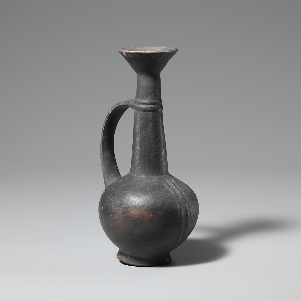 Containers such as this were first imported into Egypt in the early 18th Dynasty and are often found in modest burials. The shape of some, such as this one, seem to be modeled after the inverted seedpod of the poppy (Papaver somniferum), cut to release its sap. This suggests that the jars once held opium, which is made from the sap. Opium is a powerful sedative that can be used not only as a painkiller but also in the treatment of diarrhea, dysentery, fever, and similar complaints.