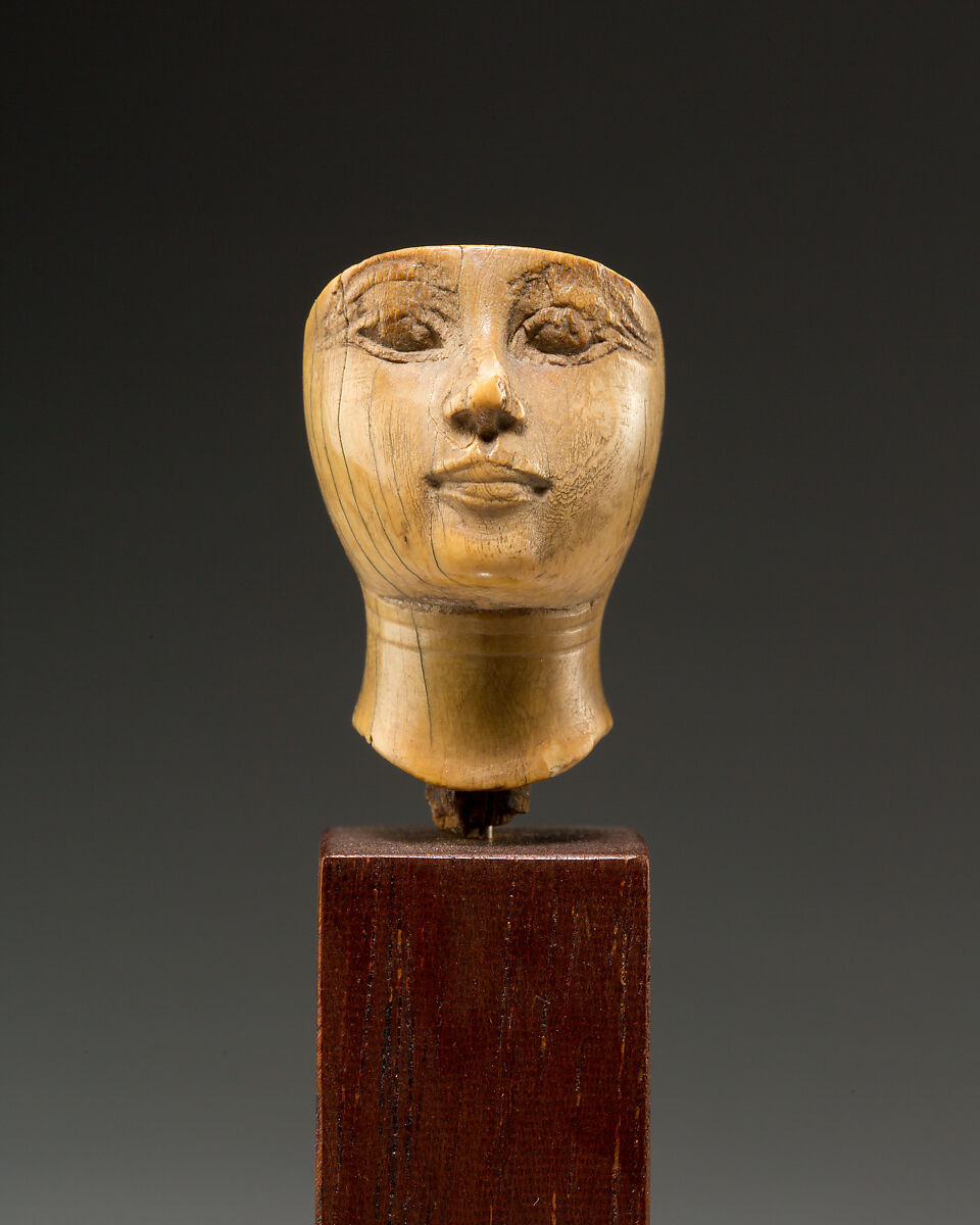 The size of this beautifully carved head might suggest that it was part of an elaborate cosmetic spoon with a handle in the form of a swimming girl. However, the lower neck edge of heads that fit such spoons is normally flattened. This example may then have actually belonged to a small ivory statuette.