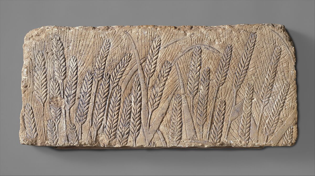 Beginning in the Old Kingdom, the harvest of grain is a typical motif in private tombs. Although temple scenes showing the pharaoh ritually cutting stalks of grain, usually held by a priest, are known from other periods, fields of the living plant are unknown in royal or temple architecture except during the Amarna Period, when representations of wild animals and living plants were common in both palaces and temples. This fragment gives no clue as to its original context. The ears of barley are lifesize and have been very naturalistically carved so that they seem to bend in a gentle breeze coming from the left. The scale and the superb quality of the relief suggests that the block formed part of a prominent scene, perhaps filling a role similar to that of the wild animals greeting the sunrise (1985.328.21)